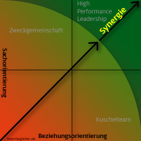 Nur wenn beide Dimensionen hoch ausgeprägt sind, kann Synergie im Team entstehen. Synergie ist er einzig wirtschaftliche Grund für Teamarbeit: Wenn die Teamarbeit das Ergebnis verbessert, als in Einzelarbeit. | |